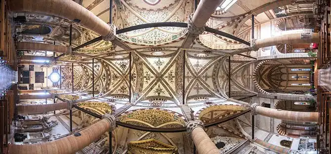 Деревянный потолок центрального нефа в виде усеченного трилистника также сохранился с XIII в.