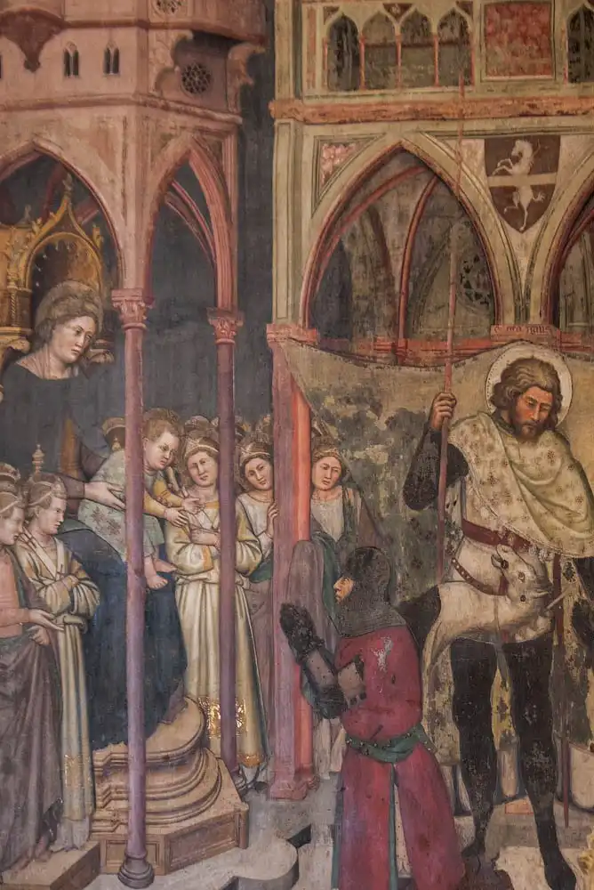 Справа от алтаря — капелла Пеллегрини. Основной её шедевр спрятался под самыми сводами трансепта — это фреска «Святой Георгий и принцесса» работы Пизанелло. Рассмотреть ее без бинокля или телевика очень трудно. Но это того стоит!