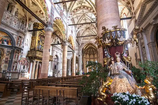 Колонны центрального нефа выполнены из красного веронского мрамора. Центральный алтарь — проект Микеле Санмикели.