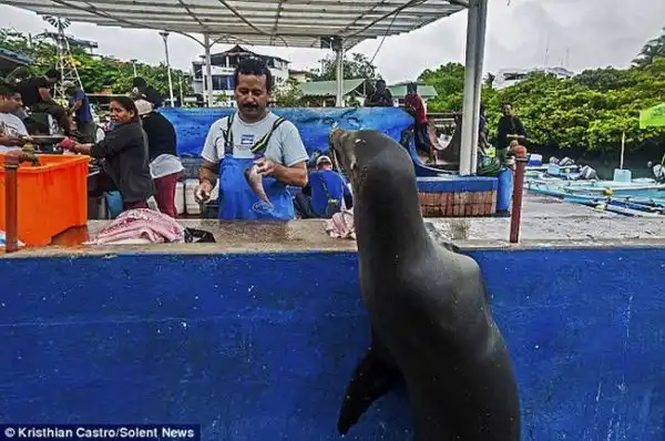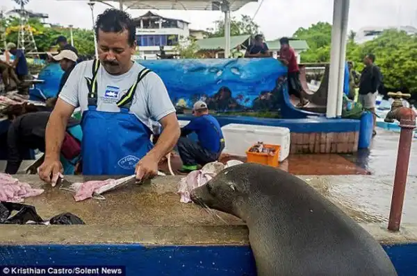 Продавец рыбы на острове Санта-Круз уже успел привыкнуть к частой гостье из океана. Морская львица почти каждый день приползает к его прилавку и ждет рыбных угощений.