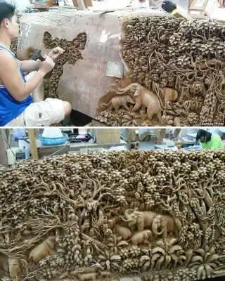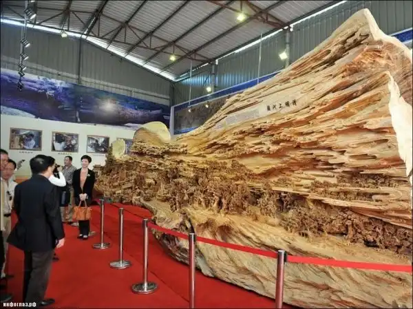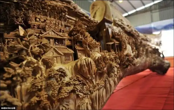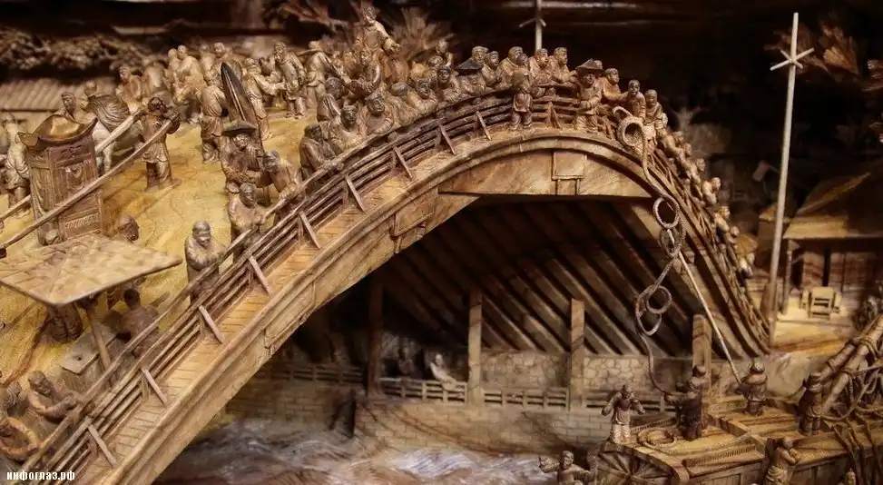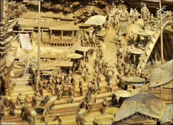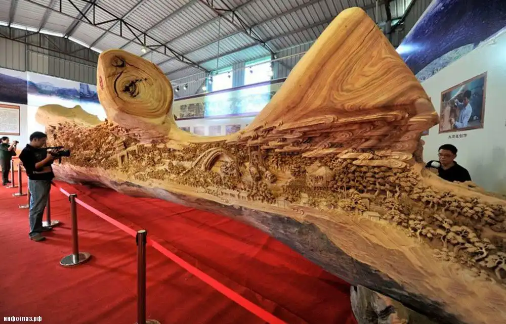 Китайский мастер деревянных скульптур Чжэн Чунхуи (Zheng Chunhui) потратил целых четыре года на создание своей деревянной скульптуры. И судя по всему не зря. Его гигантская работа,сделанная из цельного ствола дерева, оказалась самой большой деревянной скульптурой в мире. При длине 12,29 метра и высоте около трех метров, автор создал целую историю своего народа в ХІ-м столетии нашей эры. Лодки, мосты, здания и более пятисот человеческих фигурок!
