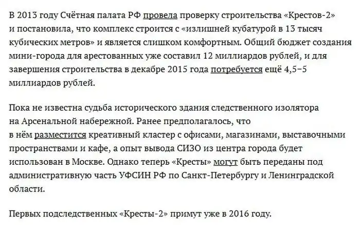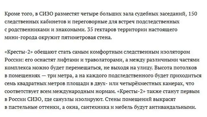 В пригороде Санкт-Петербурга, городе Колпино, ускоренными темпами продолжается строительство самого большого в Европе, а может быть даже и в мире, следственного изолятора «Кресты-2». В прошлом месяце были сданы здания первой очереди изолятора. Всего же на территории огромного сооружения будет почти 20 отдельных зданий, представляющих собой настоящий мини-город.