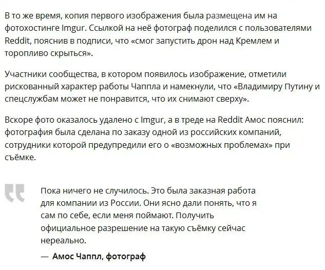 Новозеландский фотограф Амос Чаппл (Amos Chapple) удалил фото Красной площади и Кремля, которое он сделал с помощью бесполитника. На хостинге Imgur снимок пробыл всего лишь один день. Подобное действие связано с возможными действиями российских спецслужб.