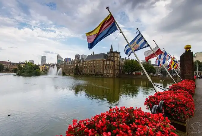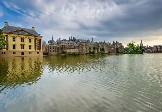 Вид на Бинненхоф со стороны Hofvijver — пруда с маленьким островком посередине: