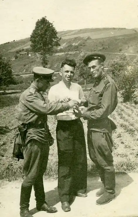 Хочу познакомить вас, с настоящими героями, ребятами охотившимися за головорезами прислуживавшими фашистам. На их счету не одна сотня бандюков пойманная в Карпатских горах и лесах. Я так надеялся разглядеть среди них своего отца и его собачку Жульку - опытную овчарку, спасшую немало жизней нашим настоящим героям, охотникам на фашистских прихвостней, бандеровцев!