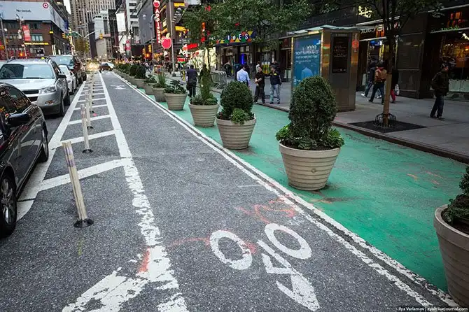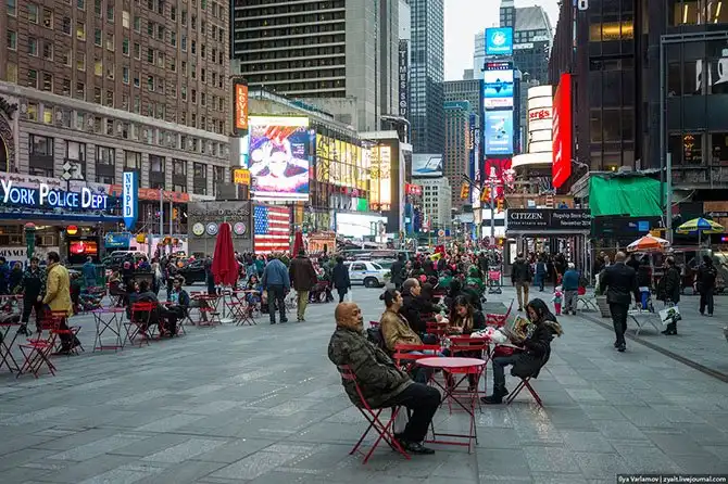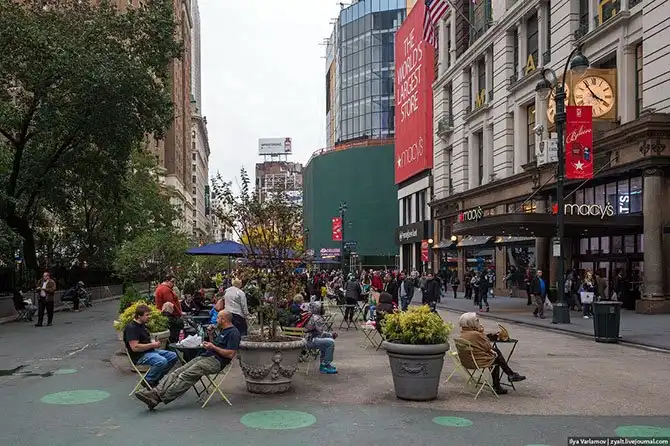Бродвей частично закрыли для машин и сделали крутую пешеходную зону.
