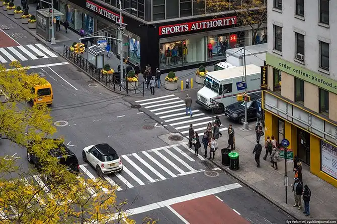 На Манхэттене везде зебры. Если переход находится не прямо на перекрестке – ставят забор.