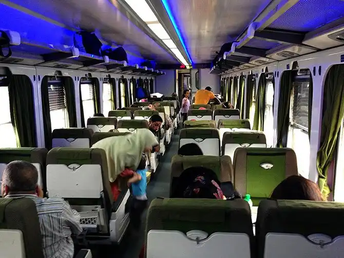 Мы даже посетили вагон-ресторан! Но там так сильно качало, что комфорта никакого. Вернулись на сиденья и снова заказали чай. Стоил он там дорого… аж 35 евроцентов. Народ сидит спокойный и интеллигентный. А вот в 3-м классе картина была удручающей, там и бедняки и студенты оккупировали все сидения, проходы и тамбуры, так как цена билета сопоставима чаю.
