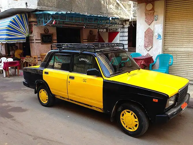 Расскажу о каждом транспорте подробнее. К примеру, в каждом городе есть своя фишка у таксистов. На юге страны, в Асуане, это старинные Пежо, они их боготворят. на севере страны, в Александрии — Жигули и даже старые Заставы, покрашенные в желто-черные цвета. В Египте есть завод АвтоВАЗ, поэтому советская машина тут стоит недорого и живет вечно, запчасти всегда под рукой. Ни о каких кондиционерах в такси Египта речи идти не может, только открытое окно не даст умереть от жары. А еще внутри такси грязно и пыльно.