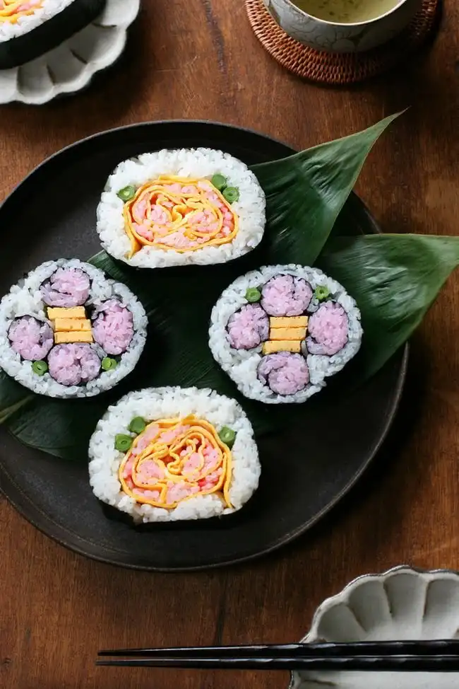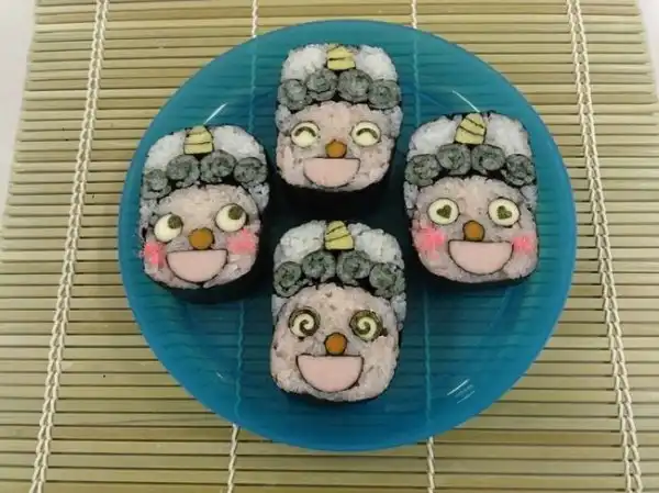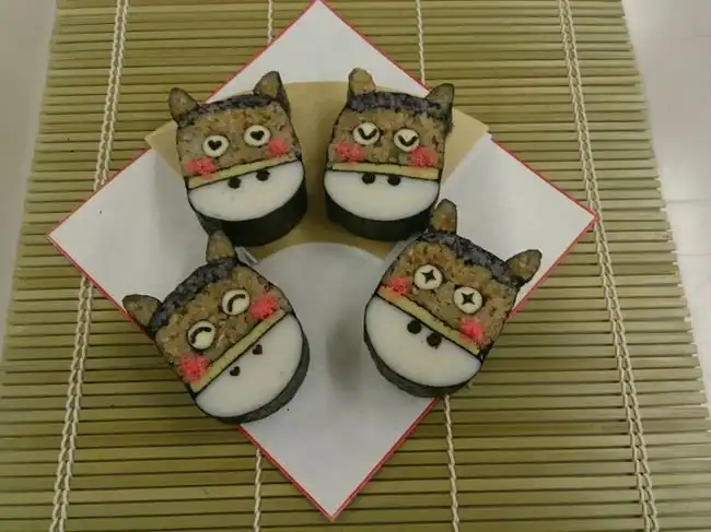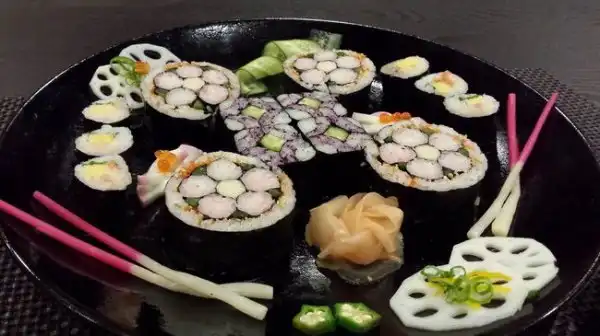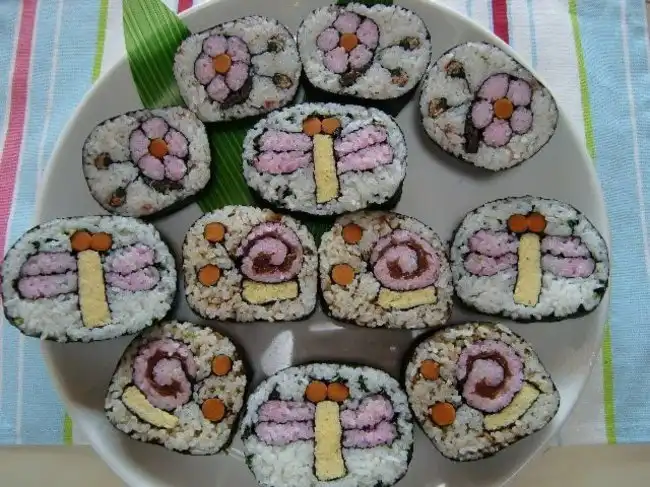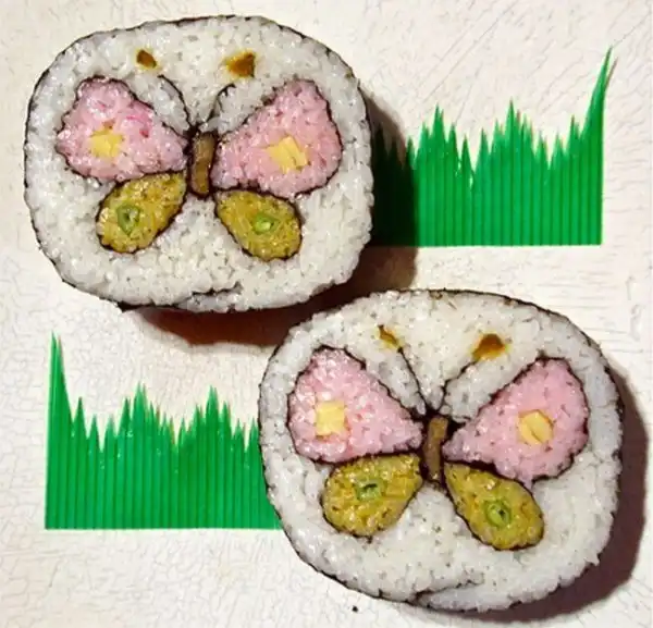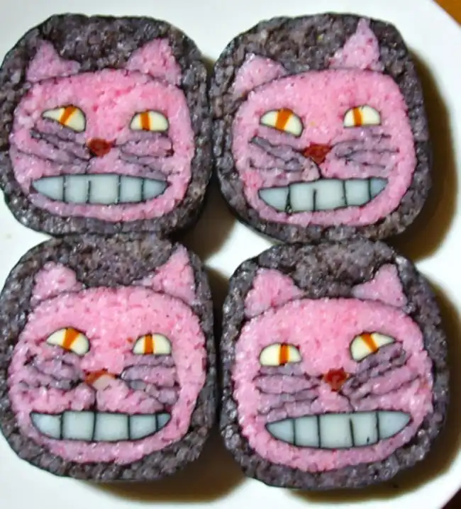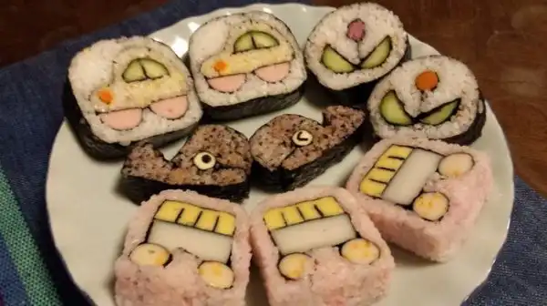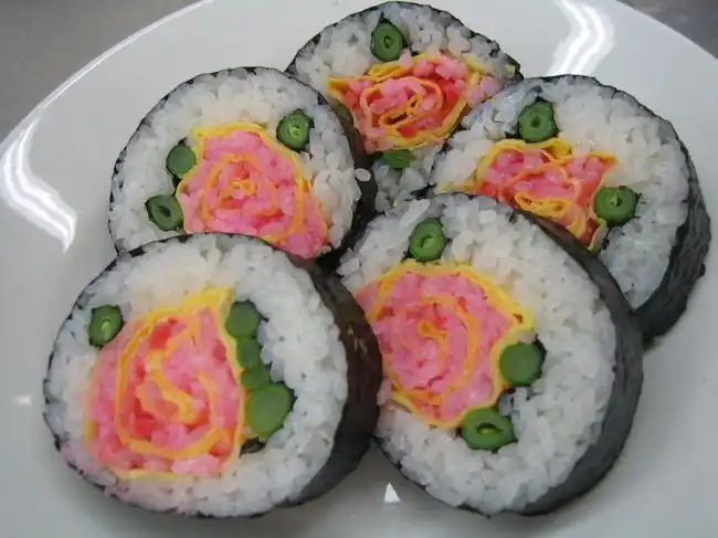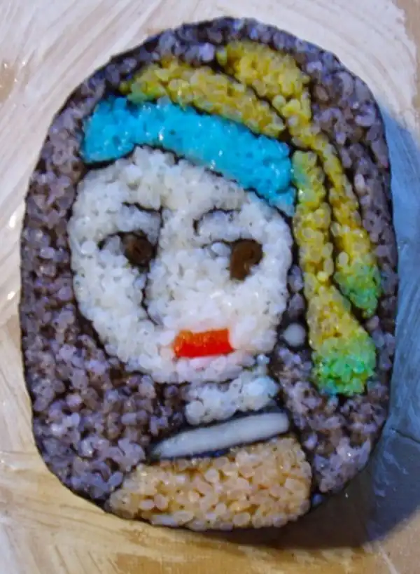 Японские шеф-повара создают настоящие картины, но не маслом по холсту, а из риса и продуктов. Сложность заключается в том, что при формировании роллов художник должен расположить разноцветные элементы начинки таким образом, чтобы на срезе получился задуманный портрет или пейзаж.