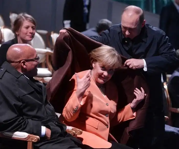 Путин помогает согреться канцлеру ФРГ Ангеле Меркель, Санкт-Петербург, 2013 год