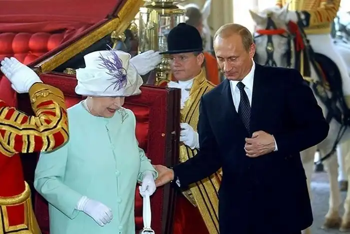 Путин помогает королеве Великобритании Елизавете II, Лондон, 2003 год