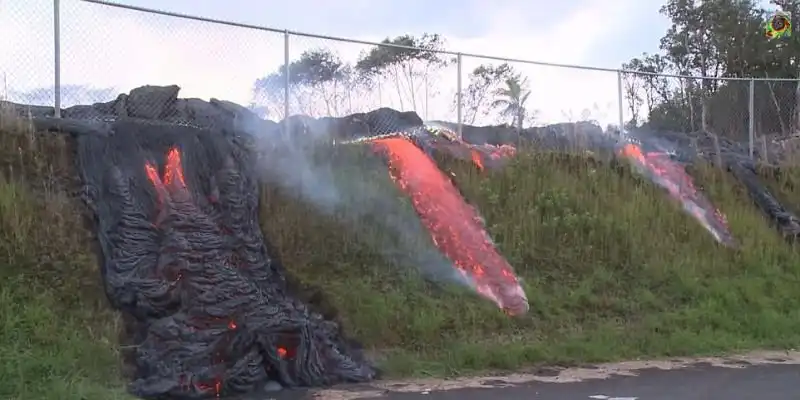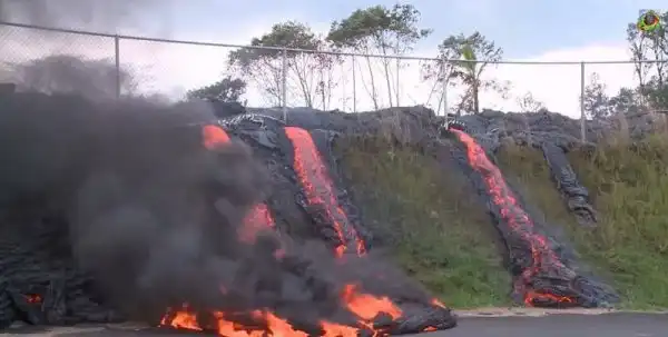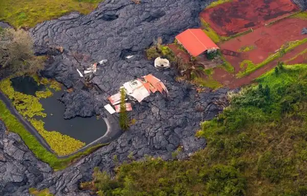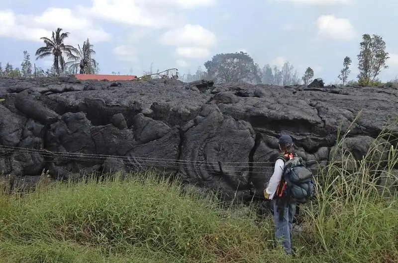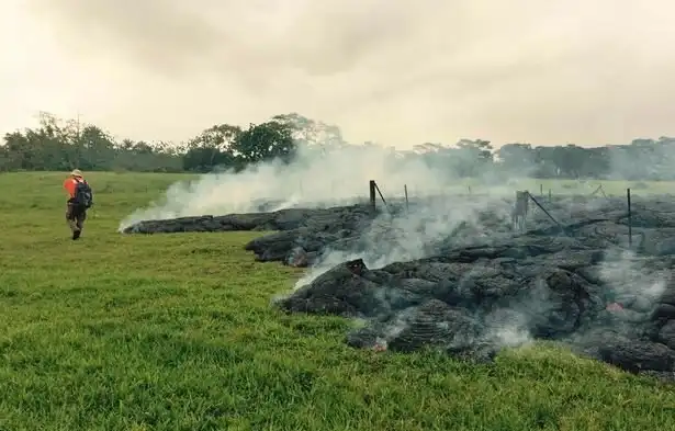 На острове Гавайи есть действующий вулкан Килауэа, и он потихоньку извергается начиная с 1983 года. Потоки лавы постепенно подбираются к населенному пункту Пахоа, в котором проживает около тысячи человек. Один домик лава уже похоронила.