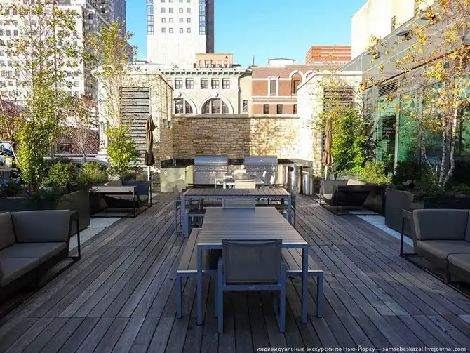 На пятом этаже есть еще одна терраса. Там диваны, столы и еще пара барбекюшниц.