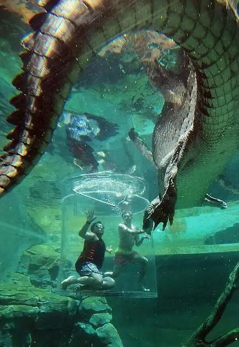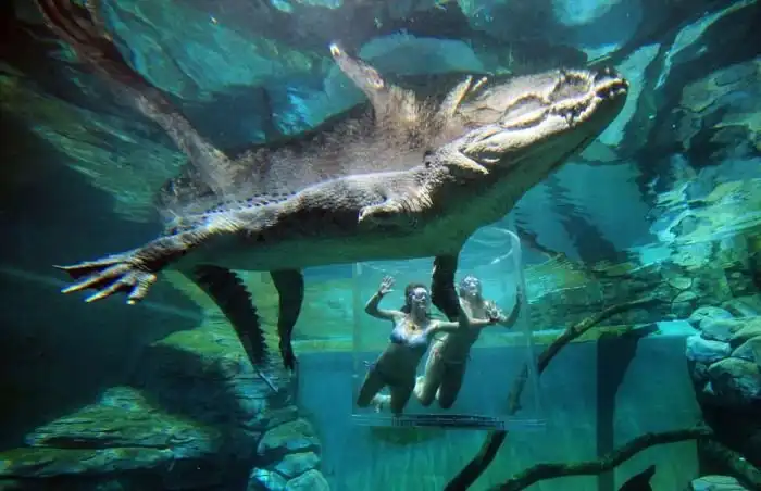 В австралийском городе Дарвин Сити есть аттракцион под названием Crocosaurus Cove, суть которого заключается в том, что вас в специальном защитном контейнере помещают в бассейн с огромным крокодилом. Длительность приключения – 20 минут.