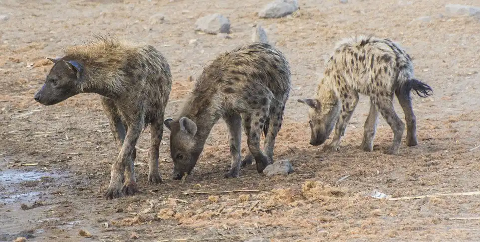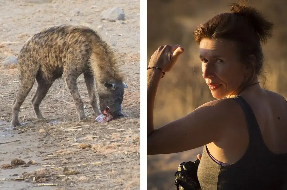 Казалось бы, гиена ловит рыбу, но нет, она ныряет целенаправленно, хочет что-то достать. Оказалось, гиена спрятала мясо под водой от других хищников. Эти кадры сняла Anja Denker (46) на водопое Этоша, Намибия.