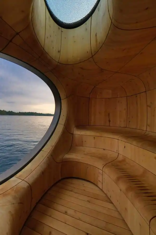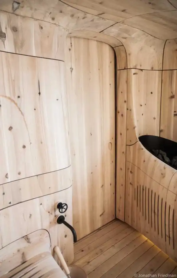 Проект называется The Grotto. То есть, создатели решили имитировать конструкцией некий грот. В сауне есть две печи. Стена со стороны скалы имеет несколько вентиляционных отверстий, уходящих глубоко в артезианские пещеры. Это позволит избегать накопления сырости и появления плесени. Для строительства был выбран кедр, что позволяет быть сауне достаточно энергоэффективной (быстрый нагрев и медленное остывание). Поверхность между двойными стенами содержит алюминиевую фольгу, что существенно задерживает тепло, вместе с буковым брусом.