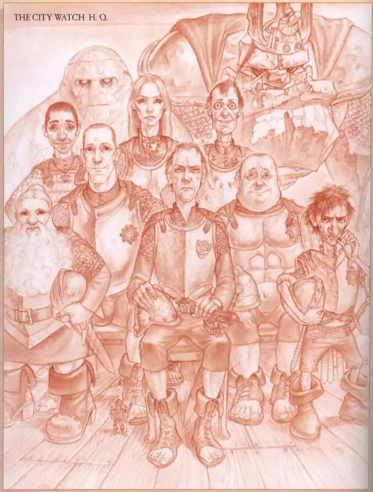 Коммандер Сэр Сэмюэль Ваймс, капитан Моркоу Железобетоннсон, сержант Фред Колон, сержант Детрит, капрал Шнобби Шноббс, капрал Шельма Задранец, констебль Дельфина Ангва фон Убервальд, констебль Редж Башмак, констебль Посети-Неверующего-С-Разъяснительным-Бук летом, констебль Двинутый Крошка Артур, специальный констебль Дорфл. Ночная Стража Анк-Морпорка.