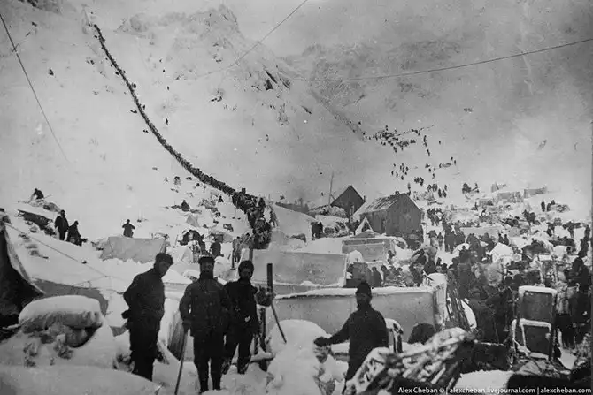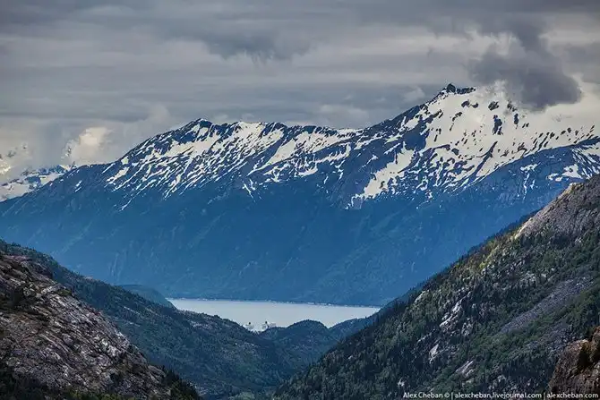 Справа – дорога через перевал White Pass, она была сложнее, но значительно короче. Здесь погибло более 3000 лошадей, поэтому долина называется Dead Horse Valley.
