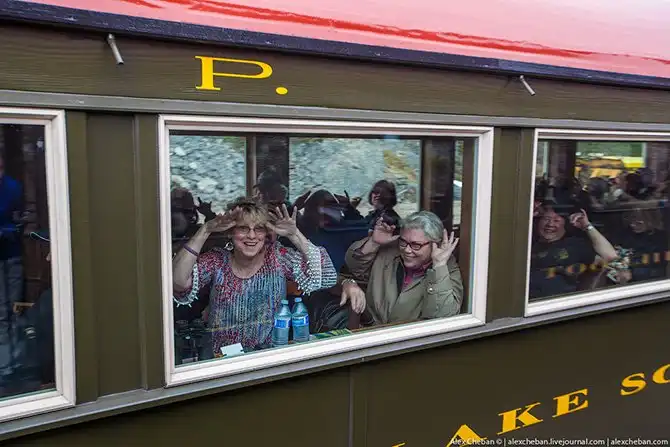 Есть также автобусные экскурсии, но это полная туфта. Автобус идет по противоположной стороне каньона и преподносится это как «автобус делает остановки и вы сможете выйти пофотографировать». На самом деле поезд едет медленно, тоже периодически останавливаясь.