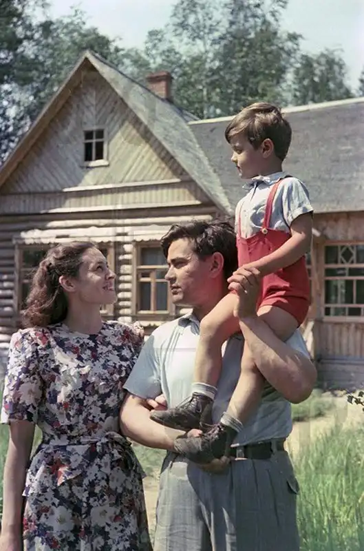 Алексей Маресьев (1916-2001) - летчик, Герой Советского Союза, прототип героя повести Бориса Полевого «Повесть о настоящем человеке» Мересьева. С женой Галиной и сыном Виктором на даче. Начало 1950-х.