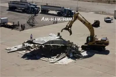 Для утилизации списанного ударного самолета Lockheed F-117 «Night Hawk» на территорию авиабазы в городе Джексонвилл, штат Флорида, приехала спецтехника компании Caterpillar, которая в считанные часы раскромсала многомиллионную машину, превратив ее в груду металлолома, которую потом вывезли на самосвалах.