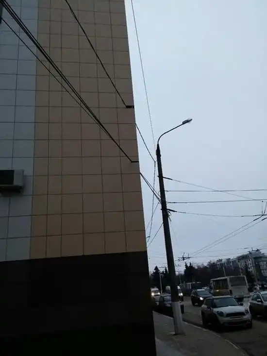 Обновляя фасад Тверской государственной медицинской академии, строительная организация не стала утруждать себя лишней работой по перемещению линии электропередач, и попросту вмуровала провода в стену здания.