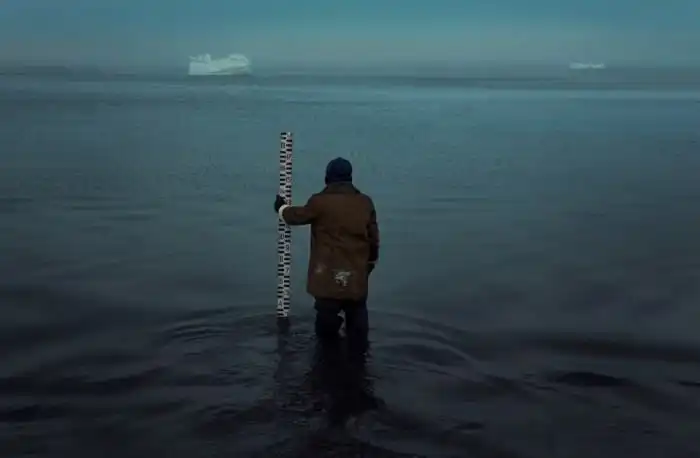 Короткий, стоя по колено в воде, замеряет уровень Баренцева моря.