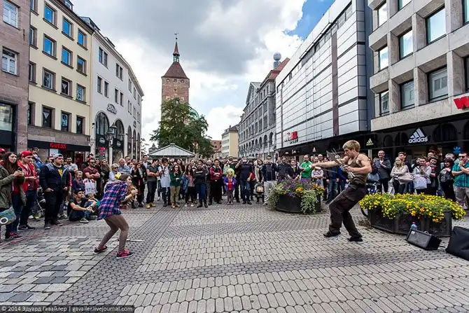 Финский уличный артист ловит кинжал, брошенный в него девочкой из публики.