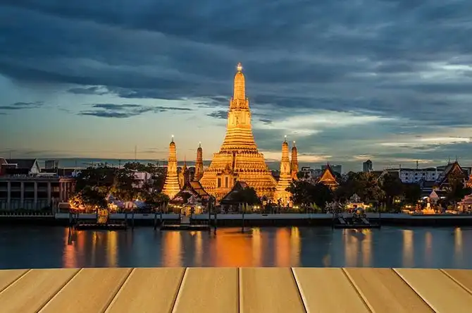Ват Арун в Бангкоке — это храм Зари, к которому ведет необычно крутая лестница. Особенно интригующе он выглядит в лучах восходящего или заходящего солнца.