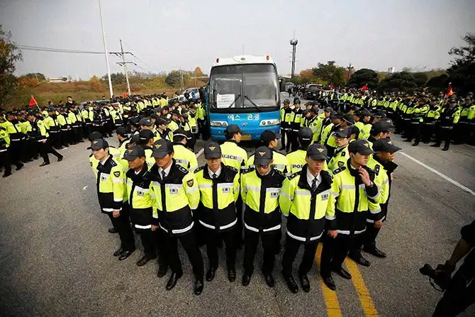 Демонстранты (против режима в Северной Корее), окруженные южнокорейскими полицейскими рядом с демилитаризованной зоной в Паджу.