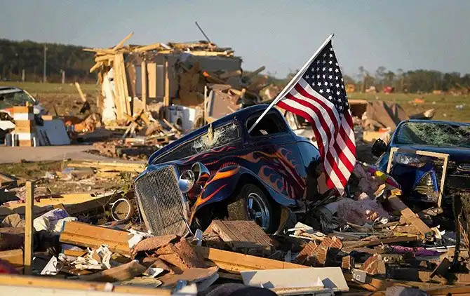 Американский флаг в автомобиле среди разрухи после торнадо около города Vilonia в Арканзасе.