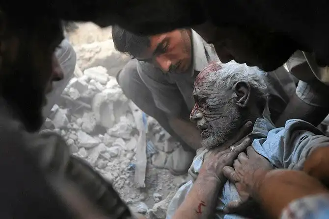 Сирийцы помогают раненому мужчине, который был раздавлен обломками в результате бомбардировки самолетов сирийских правительственных сил. Гражданская война продолжается в Сирии уже более трех лет.
