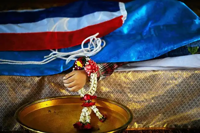 Тело ребенка, который погиб вместе со всеми братьями и сестрами в результате взрыва, произошедшего рядом с местом проведения антиправительственных протестов в Бангкоке. Ребенок был похоронен в соответствии с буддистским обрядом.