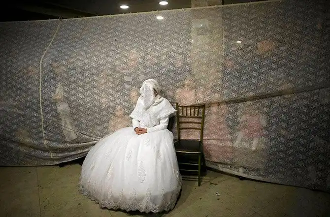 Ортодоксальная еврейка Ривка Кройс Ханна смотрит на своего жениха, который исполняет традиционный танец во время их свадебной церемонии в Иерусалиме.
