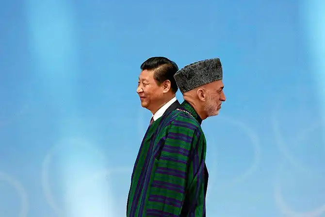 Президент Афганистана Хамид Карзай и президент Китая Си Цзиньпин идут на свои места после того, как поприветствовали друг друга перед началом церемонии открытия конференции, в которой принимали участие.