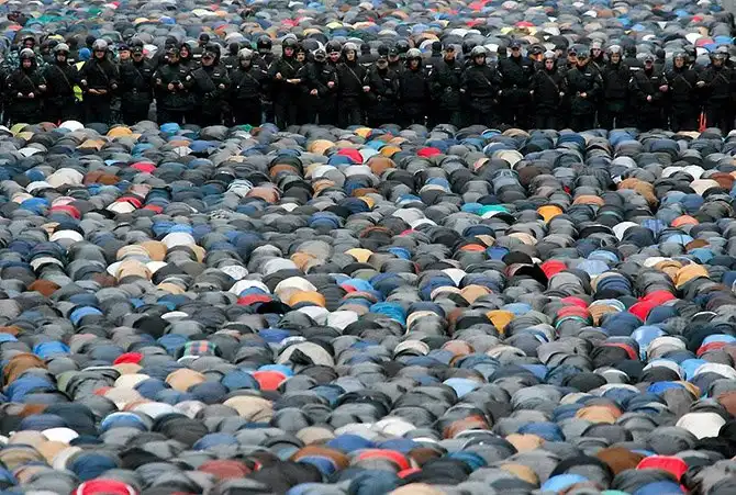 Сотрудники российского МВД, следящие за порядком во время массовой молитвы мусульман в Москве.