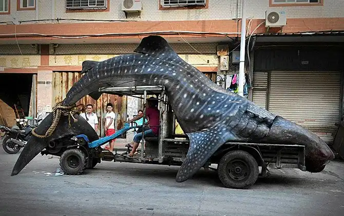 Вот это улов. Китайский рыбак из Yangzhi в провинции Fuijan перевозит свою добычу — китовую акулу.