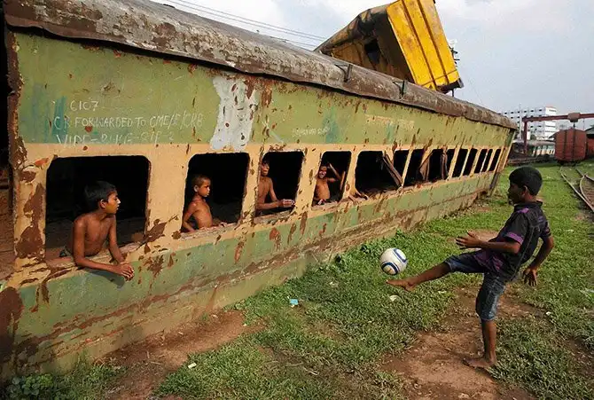 Дети играют в заброшенном вагоне в Дакке, столице Бангладеш.