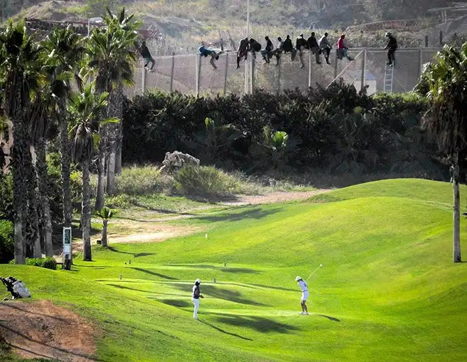 Мелилья: нелегальные иммигранты пытаются перелезть через забор в испанском анклаве в Марокко. Играющих в гольф, похоже, это совершенно не волнует.