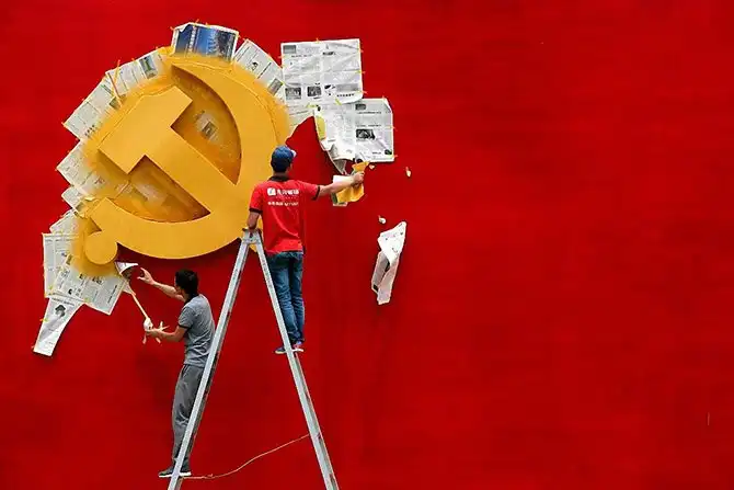 Киатйские художники красят флаг в Nanhu Revolutionary Memorial в Цзясин, в провинции Чжэцзян, в Китае.