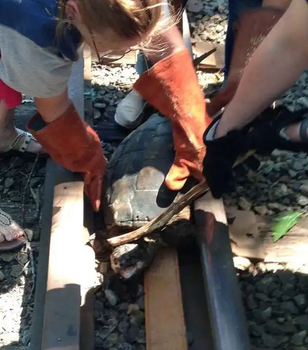 Фотоотчет о спасении черепахи, застрявшей на железнодорожных путях. Все, что для этого понадобилось – желание помочь животному и простые подручные средства.