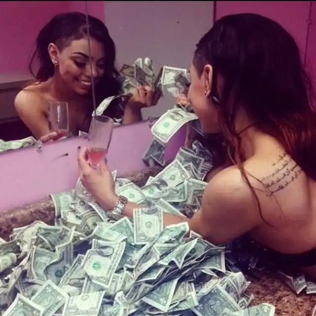 Это какая-то профессиональная стриптизёрская мода, видимо. Делать вот такие фотографии со своими заработками для социальных сетей. А заработки и правда внушают: килограммы денег, но в основном мелкие купюры по 1 доллару. Зато какой потом кайф сидеть в гримерке в куче банкнот и раскладывать их по номиналу, пересчитывать, туго утягивать пачки резинкой...