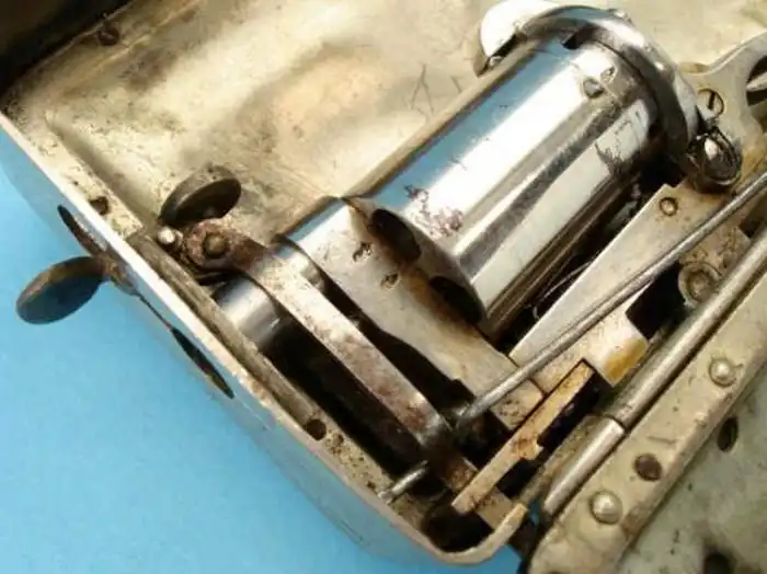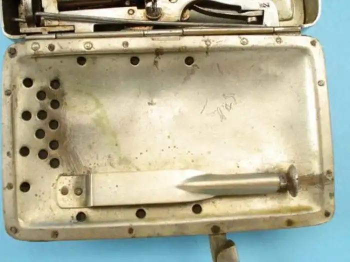 Револьвер находится в металлическом коробе, которая напоминает кошелек, портсигар или шкатулку. Длина коробочки составляет 105 мм, ширина - 65 мм. Снаружи изделие отделано кожей, а внутри имеется два отсека, в одном из которых и спрятан револьвер. Открыть данный отсек можно при помощи подпружиненной кнопки, находящейся на торцевой стороне.