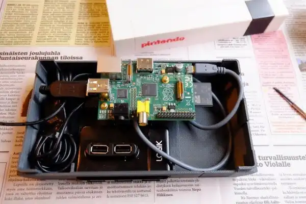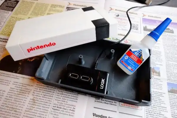 Нарисовал свой логотип "Пинтендо" с помощью маркера. Приклеил usb-хаб ко дну будущей приставки. Это самопитающийся юсб-хаб который также запитывает схемку RPi.