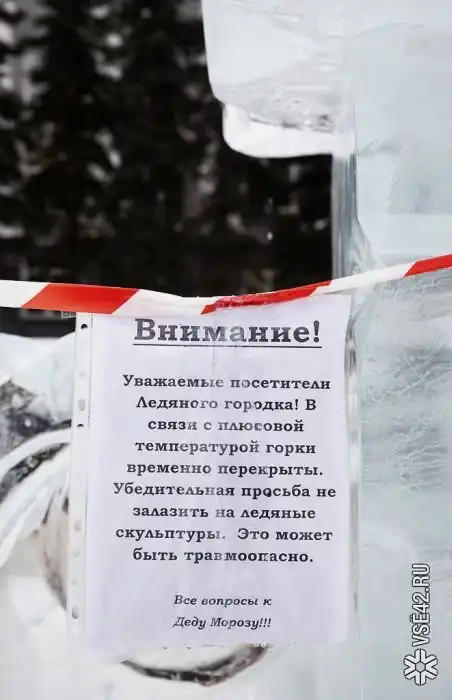 Из-за аномально теплой для декабря погоды в Кемерово закрыли ледовый городок на площади Советов. 26 декабря температура воздуха в дневные часы поднялась до 2-х градусов, из-за чего ледовые сооружения в целях безопасности горожан и гостей города пришлось закрыть для посещения. Ледовый городок опечатали лентой и развесили предупредительные надписи.