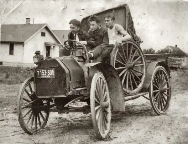 Три товарища позируют на своём автомобиле. Огайо, 1924 год.
