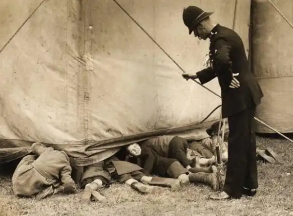 Англия, 1938. Полисмен поймал группу детишек, которые забравшись под брезентовый полог на халяву смотрят цирковое представление.