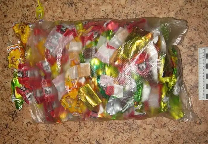 Досматривая посылку доя одного из заключенных в конфетах «Кис-Кис» нашли примерно 6 грамм гашиша и более 1 грамма метамфетамина, что считается значительным весом.