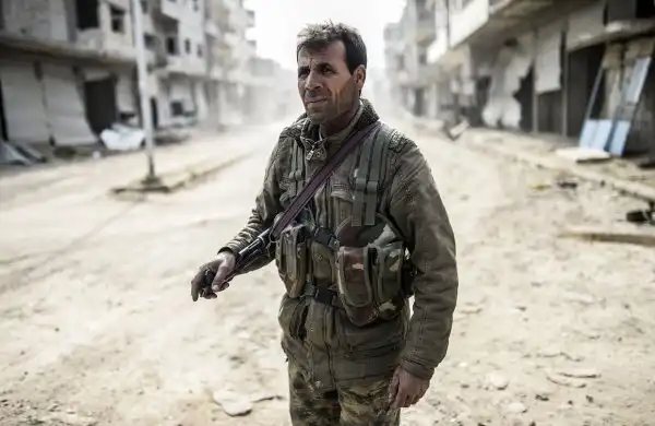 Добродушный курдский боец на фоне руин города Кобани, 29 января 2015.